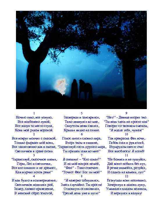 Ночная фея (Сказка) 9 1 5 "Нет!" - Девице вторит эхо. Ночью тихо, все уснуло, Засверкал и заискрился, Все подбелено луной, Тихо двинулся ко мне, "Ты ведь здесь не просто так!" Говорит со звонким смехом, Вот валун за место стула, Силуэтом девы свился, "Я ждала тебя, чужак!" Конь мой рядом вороной. Крылья видно на спине. 10 2 6 Так прекрасна Фея ночи, Все вокруг молчит с опаской, Голос льется словно лира, Гибок стан и рук изгиб, Только фыркает мой конь, Вторя эхом в тишине, Все таинственно как в сказке, "Здравствуй гость другого мира, Изумрудом светят очи! Все влюблюсь! Я погиб! Светлячков в траве огонь. Ты пришел таки ко мне!" 11 3 7 "Не божись и не тушуйся, "Здравствуй, сказочное племя, Я опешил! – "Кто такая? " Дай коню побыть без пут, Горы, Лес и светлячки, И на мой вопрос немой, В речке вымойся, разуйся, Все кто слышит и не дремлет, "Фея!" - Тихо отвечает. И садись на камень, тут!" Как журчит поток реки!" "Точно! Фея! Бог ты мой!" 12 4 8 Разнуздал коня поспешно, И как будто в подтвержденье, "Я наверно заблудился, Светлячков поднялся рой, Здесь случайно. Ты прости! Зачерпнул в ладонь луну, Умывался хладом нежным, Замер, словно приведенье, Отдохнуть остановился, И вернулся к валуну! В женский образ золотой, Третий день уже в пути!"