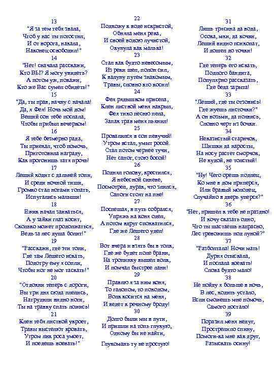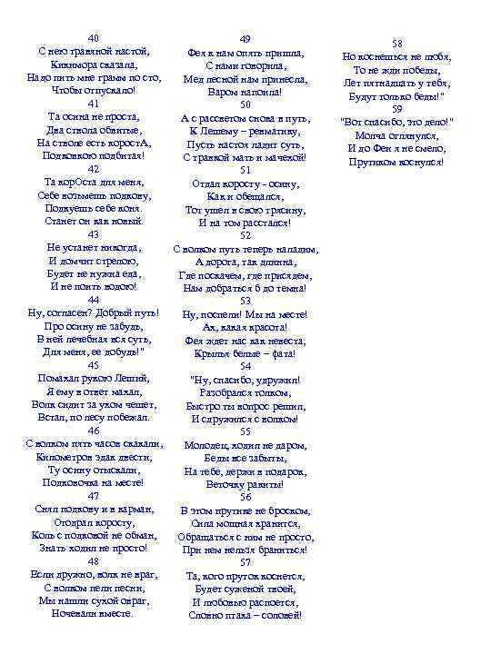 40 49 С нею травяной настой, Фея к нам опять пришла, Кикимора сказала, С нами говорила, Надо пить мне грамм по сто, Мед лесной нам принесла, Чтобы отпускало! Варом напоила! 41 50 Та осина не проста, А с рассветом снова в путь, Два ствола обвитые, К Лешему – ревматику, На стволе есть корост. А, Пусть настоя ладит суть, Подковкою подбитая! С травкой мать и мачехой! 42 51 Та кор. Оста для меня, Отдал коросту - осину, Себе возьмешь подкову, Как и обещался, Подкуешь себе коня. Тот ушел в свою трясину, Станет он как новый. И на том расстался! 43 52 Не устанет никогда, С волком путь теперь наладим, И домчит стрелою, А дорога, так длинна, Будет не нужна еда, Где поскачем, где присядем, И не поить водою! Нам добраться б до темна! 44 53 Ну, согласен? Добрый путь! Ну, поспели! Мы на месте! Про осину не забудь, Ах, какая красота! В ней лечебная вся суть, Фея ждет нас как невеста, Для меня, ее добудь!" Крылья белые – фата! 45 54 Помахал рукою Леший, "Ну, спасибо, удружил! Я ему в ответ махал, Разобрался толком, Волк сидит за ухом чешет, Быстро ты вопрос решил, Встал, по лесу побежал. И сдружился с волком! 46 55 С волком пять часов скакали, Молодец, ходил не даром, Километров эдак двести, Беды все забыты, Ту осину отыскали, На тебе, держи в подарок, Подковочка на месте! Веточку ракиты! 47 56 Снял подкову и в карман, В этом прутике не броском, Отодрал коросту, Сила мощная хранится, Коль с подковой не обман, Обращаться с ним не просто, Знать ходил не просто! При нем нельзя браниться! 48 57 Если дружно, волк не враг, Та, кого пруток коснется, С волком пели песни, Будет суженой твоей, Мы нашли сухой овраг, И любовью распоется, Ночевали вместе. Словно птаха – соловей! 58 Но коснешься не любя, То не жди победы, Лет пятнадцать у тебя, Будут только беды!" 59 "Вот спасибо, это дело!" Молча оглянулся, И до Феи я не смело, Прутиком коснулся!
