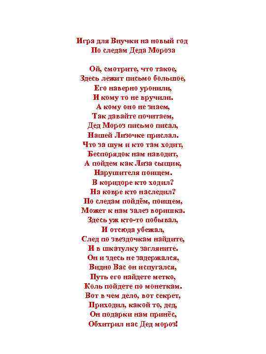 Игра для Внучки на новый год По следам Деда Мороза Ой, смотрите, что такое, Здесь лежит письмо большое, Его наверно уронили, И кому то не вручили. А кому оно не знаем, Так давайте почитаем, Дед Мороз письмо писал, Нашей Лизочке прислал. Что за шум и кто там ходит, Беспорядок нам наводит, А пойдем как Лиза сыщик, Нарушителя поищем. В коридоре кто ходил? На ковре кто наследил? По следам пойдём, поищем, Может к нам залез воришка. Здесь уж кто-то побывал, И отсюда убежал, След по звездочкам найдите, И в шкатулку загляните. Он и здесь не задержался, Видно Вас он испугался, Путь его найдете метко, Коль пойдете по монеткам. Вот в чем дело, вот секрет, Приходил, какой то, дед, Он подарки нам принёс, Обхитрил нас Дед мороз!