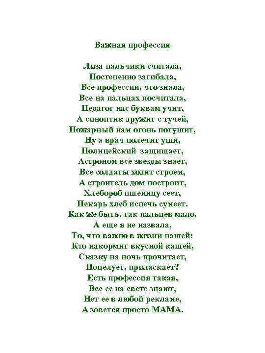Важная профессия Лиза пальчики считала, Постепенно загибала, Все профессии, что знала, Все на пальцах посчитала, Педагог нас буквам учит, А синоптик дружит с тучей, Пожарный нам огонь потушит, Ну а врач полечит уши, Полицейский защищает, Астроном все звезды знает, Все солдаты ходят строем, А строитель дом построит, Хлебороб пшеницу сеет, Пекарь хлеб испечь сумеет. Как же быть, так пальцев мало, А еще я не назвала, То, что важно в жизни нашей: Кто накормит вкусной кашей, Сказку на ночь прочитает, Поцелует, приласкает? Есть профессия такая, Все ее на свете знают, Нет ее в любой рекламе, А зовется просто МАМА.