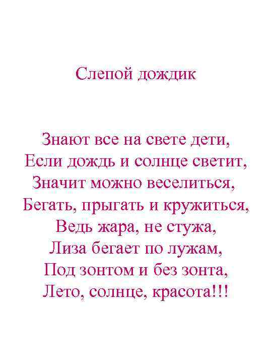 Слепой дождик Знают все на свете дети, Если дождь и солнце светит, Значит можно веселиться, Бегать, прыгать и кружиться, Ведь жара, не стужа, Лиза бегает по лужам, Под зонтом и без зонта, Лето, солнце, красота!!!