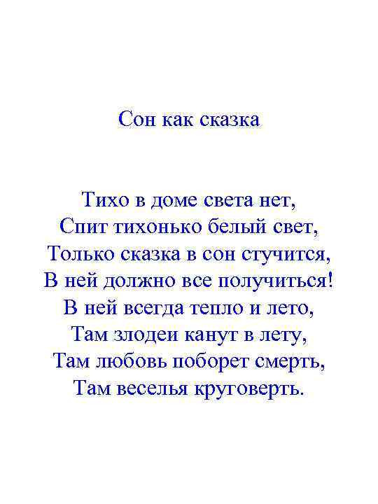 Сон как сказка Тихо в доме света нет, Спит тихонько белый свет, Только сказка в сон стучится, В ней должно все получиться! В ней всегда тепло и лето, Там злодеи канут в лету, Там любовь поборет смерть, Там веселья круговерть.