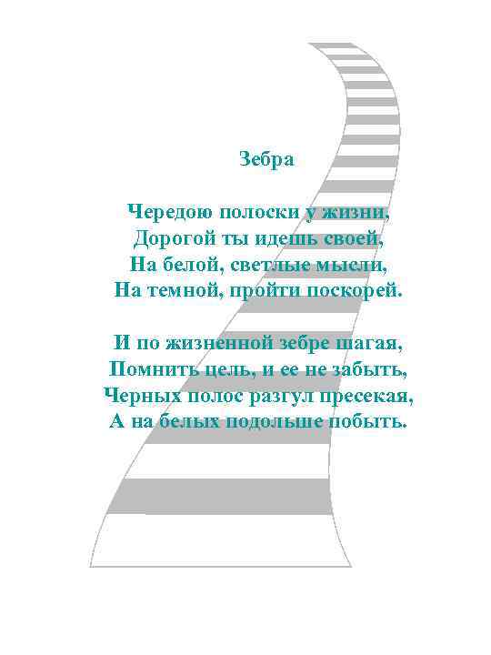 Зебра Чередою полоски у жизни, Дорогой ты идешь своей, На белой, светлые мысли, На темной, пройти поскорей. И по жизненной зебре шагая, Помнить цель, и ее не забыть, Черных полос разгул пресекая, А на белых подольше побыть.