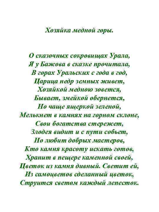 Хозяйка медной горы. О сказочных сокровищах Урала, Я у Бажова в сказке прочитала, В горах Уральских с года в год, Царица недр земных живет, Хозяйкой медною зовется, Бывает, змейкой обернется, Но чаще ящеркой зеленой, Мелькнет в камнях на горном склоне, Свои богатства стережет, Злодея видит и с пути собьет, Но любит добрых мастеров, Кто камня красоту искать готов, Хранит в пещере каменной своей, Цветок из камня дивный. Светит ей, Из самоцветов сделанный цветок, Струится светом каждый лепесток.