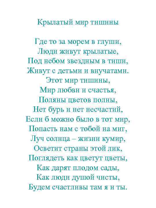Крылатый мир тишины Где то за морем в глуши, Люди живут крылатые, Под небом звездным в тиши, Живут с детьми и внучатами. Этот мир тишины, Мир любви и счастья, Поляны цветов полны, Нет бурь и нет несчастий, Если б можно было в тот мир, Попасть нам с тобой на миг, Луч солнца – жизни кумир, Осветит страны этой лик, Поглядеть как цветут цветы, Как дарят плодом сады, Как люди душой чисты, Будем счастливы там я и ты.