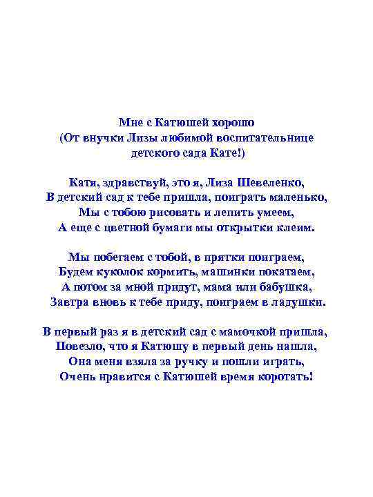 Мне с Катюшей хорошо (От внучки Лизы любимой воспитательнице детского сада Кате!) Катя, здравствуй, это я, Лиза Шевеленко, В детский сад к тебе пришла, поиграть маленько, Мы с тобою рисовать и лепить умеем, А еще с цветной бумаги мы открытки клеим. Мы побегаем с тобой, в прятки поиграем, Будем куколок кормить, машинки покатаем, А потом за мной придут, мама или бабушка, Завтра вновь к тебе приду, поиграем в ладушки. В первый раз я в детский сад с мамочкой пришла, Повезло, что я Катюшу в первый день нашла, Она меня взяла за ручку и пошли играть, Очень нравится с Катюшей время коротать!