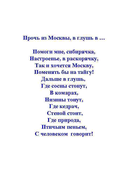 Прочь из Москвы, в глушь в … Помоги мне, сибирячка, Настроенье, в раскорячку, Так и хочется Москву, Поменять бы на тайгу! Дальше в глушь, Где сосны стонут, В комарах, Низины тонут, Где кедрач, Стеной стоит, Где природа, Птичьим пеньем, С человеком говорит!