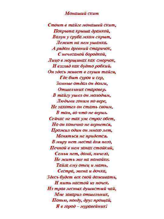 Монаший скит Стоит в тайге монаший скит, Покрыта крыша дранкой, Валун у сруба мхом cкрыт, Лежит на нем ушанка. А рядом древний старичок, С нечесаной бородкой, Лицо в морщинах как сморчок, И взгляд как будто робкий. Он здесь живет в глуши тайги, Где быт суров и сер, Земные отдал он долги, Отшельник старовер. В тайгу ушел он молодым, Людьми гоним по вере, Не захотел он стать своим, В том, во что не верил. Сейчас не так уж строг обет, Но он конечно не вернется, Прожил один он много лет, Меняться не придется. В миру нет места для него, Печной в нем запах стойкий, Семьи нет, дома, ничего, Не жить же на помойке. Тайга ему отец и мать, Сестра, жена и дочка, Здесь будет век свой доживать, И пить настой из почек. Из трав лесных душистый чай, Мне заварил отшельник, Попью, поеду, друг прощай, Я в город – муравейник!
