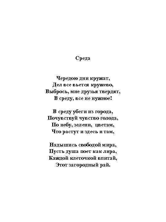 Среда Чередою дни кружат, Дел все вьется кружево, Выбрось, мне друзья твердят, В среду, все не нужное! В среду убеги из города, Почувствуй чувство голода, По небу, зелени, цветам, Что растут и здесь и там, Надышись свободой мира, Пусть душа поет как лира, Каждой клеточкой впитай, Этот загородный рай.