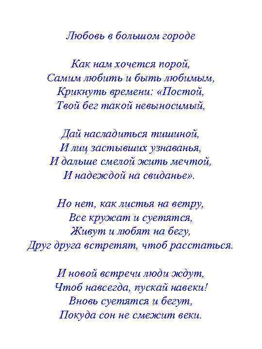 Любовь в большом городе Как нам хочется порой, Самим любить и быть любимым, Крикнуть времени: «Постой, Твой бег такой невыносимый, Дай насладиться тишиной, И лиц застывших узнаванья, И дальше смелой жить мечтой, И надеждой на свиданье» . Но нет, как листья на ветру, Все кружат и суетятся, Живут и любят на бегу, Друг друга встретят, чтоб расстаться. И новой встречи люди ждут, Чтоб навсегда, пускай навеки! Вновь суетятся и бегут, Покуда сон не смежит веки.