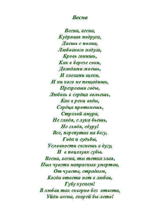 Весна, весна, Кудрявая подруга, Даешь с полна, Любовного недуга, Кровь гонишь, Как в березе соки, Дождями моешь, И слезами щеки, И ни кого не пощадишь, Презревши годы, Любовь в сердца вольешь, Как в реки воды, Сердца проткнешь, Стрелой амура, Не глядя, с лука бьешь, Не глядя, сдуру! Все, перепутав на бегу, Года и судьбы, Условности согнешь в дугу, И в поцелуях губы. Весна, весна, ты тетка злая, Пыл чувств напрасных умертви, От чувств, страдаем, Когда ответа нет в любви, Губу кусаем! В любви так скверно без ответа, Уйди весна, скорей бы лето!