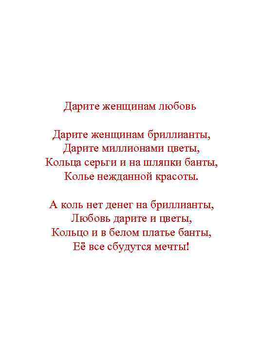 Дарите женщинам любовь Дарите женщинам бриллианты, Дарите миллионами цветы, Кольца серьги и на шляпки банты, Колье нежданной красоты. А коль нет денег на бриллианты, Любовь дарите и цветы, Кольцо и в белом платье банты, Её все сбудутся мечты!