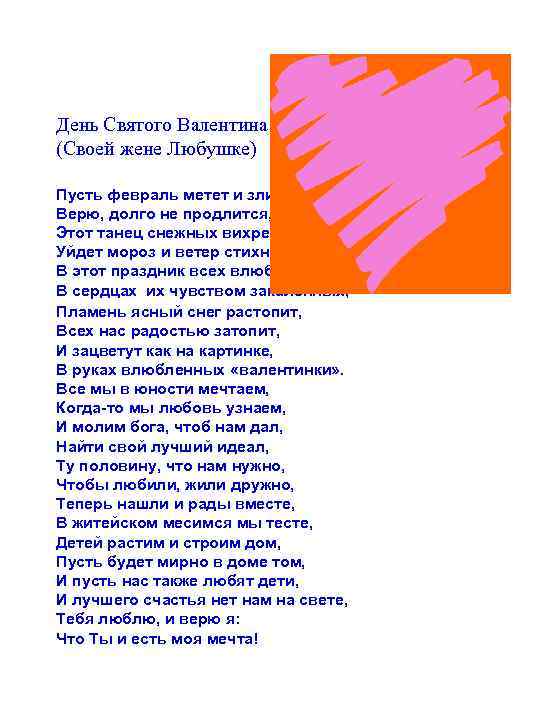 День Святого Валентина (Своей жене Любушке) Пусть февраль метет и злится, Верю, долго не продлится, Этот танец снежных вихрей, Уйдет мороз и ветер стихнет, В этот праздник всех влюбленных, В сердцах их чувством закаленных, Пламень ясный снег растопит, Всех нас радостью затопит, И зацветут как на картинке, В руках влюбленных «валентинки» . Все мы в юности мечтаем, Когда-то мы любовь узнаем, И молим бога, чтоб нам дал, Найти свой лучший идеал, Ту половину, что нам нужно, Чтобы любили, жили дружно, Теперь нашли и рады вместе, В житейском месимся мы тесте, Детей растим и строим дом, Пусть будет мирно в доме том, И пусть нас также любят дети, И лучшего счастья нет нам на свете, Тебя люблю, и верю я: Что Ты и есть моя мечта!