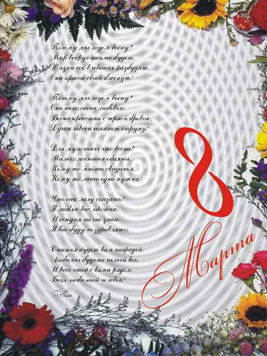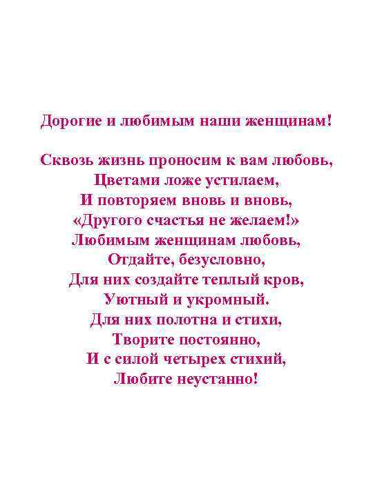 Дорогие и любимым наши женщинам! Сквозь жизнь проносим к вам любовь, Цветами ложе устилаем, И повторяем вновь и вновь, «Другого счастья не желаем!» Любимым женщинам любовь, Отдайте, безусловно, Для них создайте теплый кров, Уютный и укромный. Для них полотна и стихи, Творите постоянно, И с силой четырех стихий, Любите неустанно!