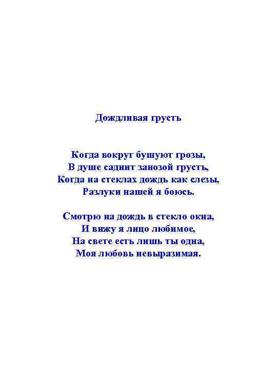Дождливая грусть Когда вокруг бушуют грозы, В душе саднит занозой грусть, Когда на стеклах дождь как слезы, Разлуки нашей я боюсь. Смотрю на дождь в стекло окна, И вижу я лицо любимое, На свете есть лишь ты одна, Моя любовь невыразимая.