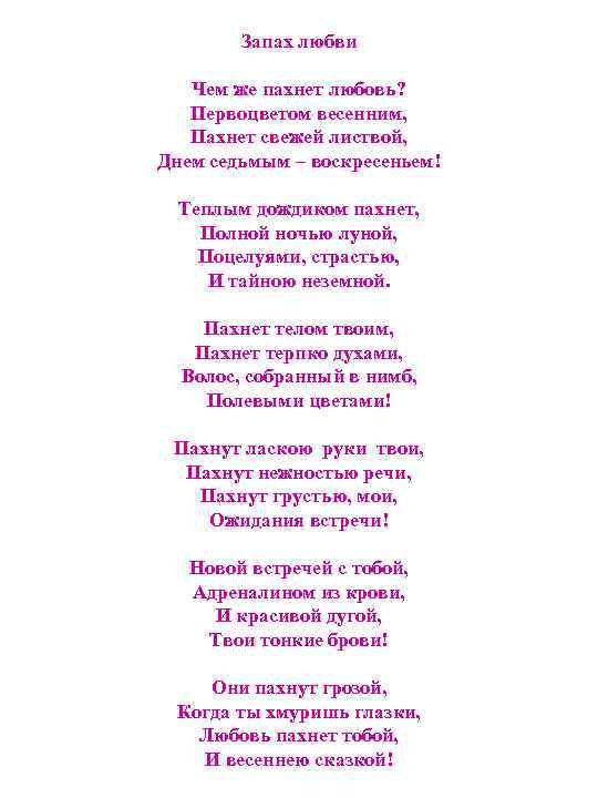 Запах любви Чем же пахнет любовь? Первоцветом весенним, Пахнет свежей листвой, Днем седьмым – воскресеньем! Теплым дождиком пахнет, Полной ночью луной, Поцелуями, страстью, И тайною неземной. Пахнет телом твоим, Пахнет терпко духами, Волос, собранный в нимб, Полевыми цветами! Пахнут ласкою руки твои, Пахнут нежностью речи, Пахнут грустью, мои, Ожидания встречи! Новой встречей с тобой, Адреналином из крови, И красивой дугой, Твои тонкие брови! Они пахнут грозой, Когда ты хмуришь глазки, Любовь пахнет тобой, И весеннею сказкой!