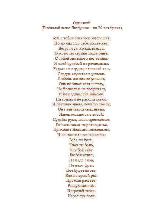 Однолюб (Любимой жене Любушке – на 20 лет брака) Мы с тобой знакомы много лет, Но до сих пор тебя милее нет, Бегут года, но как всегда, В моем ты сердце лишь одна. С тобой мы много лет едины, И злой судьбой не разделимы, Родством сердец и мыслей тон, Сердца стучатся в унисон. Любовь же век не угасает, Она не знает свет и тьму, Не блекнет и не выцветает, И не подвластна никому. Ни годам и не расставаньям, И светлым днем, ночною тьмой, Она венчается свиданьем, Навек останется с тобой. Судьбы рука, лишь проведенье, Любовь несет миротворенье, Приходит Божьим повеленьем, И от нее нам нет спасенья: Моя ли боль, Твоя ли боль, Улыбок свет, Любви ответ, Не надо слов, Не надо фраз, Все будет вновь, Как в первый раз. Прожив рассвет, Разлук нам нет, Встречай закат, Небесных врат.