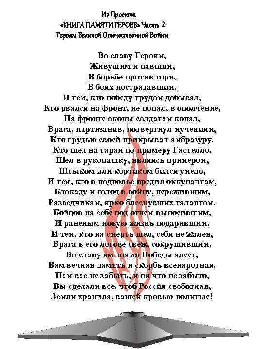 Из Проекта «КНИГА ПАМЯТИ ГЕРОЕВ» Часть 2 Героям Великой Отечественной Войны Во славу Героям, Живущим и павшим, В борьбе против горя, В боях пострадавшим, И тем, кто победу трудом добывал, Кто рвался на фронт, не попал, в ополчение, На фронте окопы солдатам копал, Врага, партизанив, подвергнул мучениям, Кто грудью своей прикрывал амбразуру, Кто шел на таран по примеру Гастелло, Шел в рукопашку, являясь примером, Штыком или кортиком бился умело, И тем, кто в подполье вредил оккупантам, Блокаду и голод в войну, пережившим, Разведчикам, ярко блеснувших талантом. Бойцов на себе под огнем выносившим, И раненым новую жизнь подарившим, И тем, кто на смерть шел, себя не жалея, Врага в его логове свеж, сокрушившим, Во славу им знамя Победы алеет, Вам вечная память и скорбь всенародная, Нам вас не забыть, и ни что не забыто, Вы сделали все, чтоб Россия свободная, Земли хранила, вашей кровью политые!