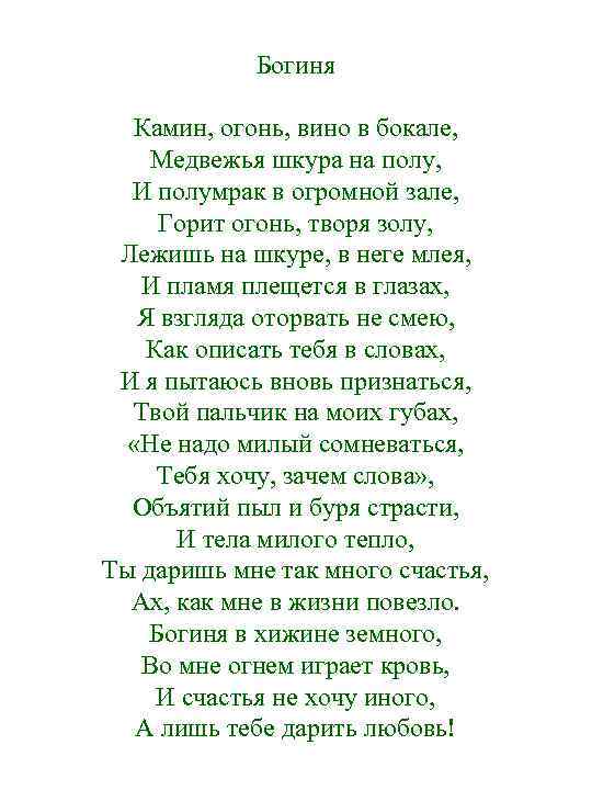 Богиня Камин, огонь, вино в бокале, Медвежья шкура на полу, И полумрак в огромной зале, Горит огонь, творя золу, Лежишь на шкуре, в неге млея, И пламя плещется в глазах, Я взгляда оторвать не смею, Как описать тебя в словах, И я пытаюсь вновь признаться, Твой пальчик на моих губах, «Не надо милый сомневаться, Тебя хочу, зачем слова» , Объятий пыл и буря страсти, И тела милого тепло, Ты даришь мне так много счастья, Ах, как мне в жизни повезло. Богиня в хижине земного, Во мне огнем играет кровь, И счастья не хочу иного, А лишь тебе дарить любовь!