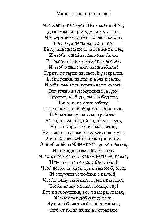 Много ли женщине надо? Что женщине надо? Не скажет любой, Даже самый премудрый мужчина, Что сердце затронет, посеет любовь, Всерьез, а не на дармовщину! Ей лучше не на ночь, а все же на век, И чтобы с ней вы ласковы были, И помнить всегда, что она человек, И чтоб о ней никогда не забыли! Дарите подарки цветастой раски, Безделушки, цветы, и ночь и зарю, И себя самого подарите как в сказке, Это точно я вам мужики говорю! Грустит, не беда, ты ее ободрил, Тепло подарил и заботу, И вечером ты, чтоб домой приходил, С букетом красивым, с работы! Ей надо немного, ей надо чуть-чуть, Но, чтоб для нее, только лично, Не важна тогда ссор скоротечная муть, Лишь бы вел себя с нею прилично! О любви ей чтоб нежно на ушко шептал, Или глядя в глаза без утайки, Чтоб к фонарным столбам ее не ревновал, И не шастал по дому без майки! Чтоб носки ты свои тут и там не бросал, И закручивал тюбики с пастой, Чтобы тещу ты мамой всегда называл, Чтобы водку не пил понапрасну! Вот и все мужики, все я вам рассказал, Жены сами добавят детали, Ну а их обижать я бы не рисковал, Чтоб от гнева их вы не страдали!