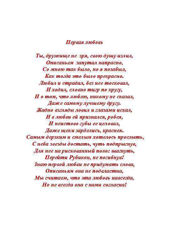 Первая любовь Ты, дружище не зря, свою душу излил, Описаньем запутал напрасно, Со мною так было, но я позабыл, Как тогда это было прекрасно. Любил и страдал, без нее тосковал, И ходил, словно тигр по кругу, И о том, что люблю, никому не сказал, Даже самому лучшему другу. Жадно взгляды ловил и глазами искал, И в любви ей признался, робея, И неистово губы ее целовал, Даже щеки зарделись, краснея. Самым дерзким и смелым хотелось прослыть, С неба звезды достать, чуть подпрыгнув, Для нее на рискованный полог шагнуть, Перейти Рубикон, не погибнув! Знаю первой любви не придумать слова, Описаньям она не подвластна, Мы считаем, что эта любовь навсегда, Но не всегда она с нами согласна!