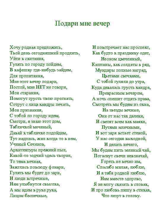 Подари мне вечер Хочу родная предложить, Твой день сегодняшний продлить, Уйти в скитания, Гулять по городу пойдем, В кафешку где-нибудь зайдем, Для пропитания, Мне этот вечер подари, Постой, мне НЕТ не говори, Мои старания, Помогут грусть твою прогнать, Сотрут с лица хандры печать, Мои признания, С тобой по городу идем, Смотри, я знаю этот дом, Табличкой меченый, Давай к табличке подойдем, Тут надпись, жил когда то в нем, Ученый Сеченов, Архитектуры прежний пыл, Какой-то зодчий здесь творил, То тема вечная, Зажглись повсюду фонари, Гулять мы будет до зари, И люди встречные, Нам улыбнутся свысока, А мы идем в руке рука, Лицом беспечные, И повстречает нас проспект, Как будто к празднику одет, Неоном цвеченный, Каштаны, как солдаты в ряд, Мундиры полные наград, Цветами свечками, С тобой гуляли до утра, Куда девалась грусть хандра, Прекрасным вечером, А ночь спешит отдать права, Смотреть мы будем из окна, На звезды вечные, Они от нас так далеки, И светят всем как маяки, Путями млечными, И вот заря встает стеной, У нас сегодня выходной, И делать нечего, Мы будем пить зеленый чай, Погаснут свечи невзначай, Гореть не вечно им, Спасибо милая, люблю, И я тебя родной люблю, Нам вместе здорово, Я не могу сказать в словах, И про любовь пишу в стихах, Что лезут в голову.