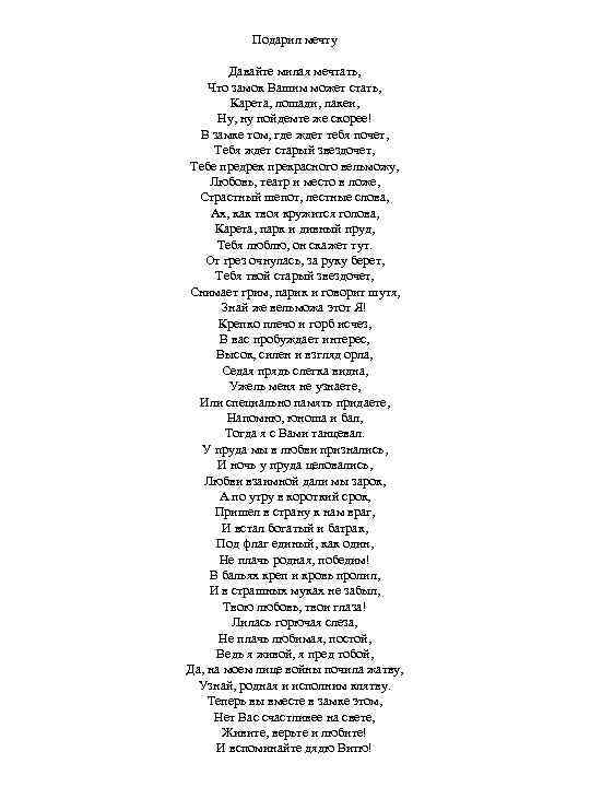 Подарил мечту Давайте милая мечтать, Что замок Вашим может стать, Карета, лошади, лакеи, Ну, ну пойдемте же скорее! В замке том, где ждет тебя почет, Тебя ждет старый звездочет, Тебе предрек прекрасного вельможу, Любовь, театр и место в ложе, Страстный шепот, лестные слова, Ах, как твоя кружится голова, Карета, парк и дивный пруд, Тебя люблю, он скажет тут. От грез очнулась, за руку берет, Тебя твой старый звездочет, Снимает грим, парик и говорит шутя, Знай же вельможа этот Я! Крепко плечо и горб исчез, В вас пробуждает интерес, Высок, силен и взгляд орла, Седая прядь слегка видна, Ужель меня не узнаете, Или специально память придаете, Напомню, юноша и бал, Тогда я с Вами танцевал. У пруда мы в любви признались, И ночь у пруда целовались, Любви взаимной дали мы зарок, А по утру в короткий срок, Пришел в страну к нам враг, И встал богатый и батрак, Под флаг единый, как один, Не плачь родная, победим! В бальях креп и кровь пролил, И в страшных муках не забыл, Твою любовь, твои глаза! Лилась горючая слеза, Не плачь любимая, постой, Ведь я живой, я пред тобой, Да, на моем лице войны почила жатву, Узнай, родная и исполним клятву. Теперь вы вместе в замке этом, Нет Вас счастливее на свете, Живите, верьте и любите! И вспоминайте дядю Витю!