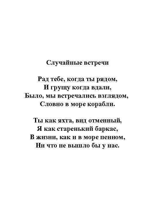 Случайные встречи Рад тебе, когда ты рядом, И грущу когда вдали, Было, мы встречались взглядом, Словно в море корабли. Ты как яхта, вид отменный, Я как старенький баркас, В жизни, как и в море пенном, Ни что не вышло бы у нас.
