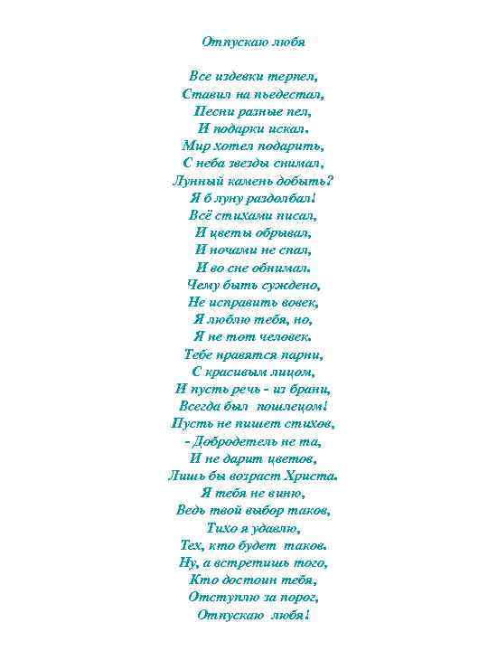 Отпускаю любя Все издевки терпел, Ставил на пьедестал, Песни разные пел, И подарки искал. Мир хотел подарить, С неба звезды снимал, Лунный камень добыть? Я б луну раздолбал! Всё стихами писал, И цветы обрывал, И ночами не спал, И во сне обнимал. Чему быть суждено, Не исправить вовек, Я люблю тебя, но, Я не тот человек. Тебе нравятся парни, С красивым лицом, И пусть речь - из брани, Всегда был пошлецом! Пусть не пишет стихов, - Добродетель не та, И не дарит цветов, Лишь бы возраст Христа. Я тебя не виню, Ведь твой выбор таков, Тихо я удавлю, Тех, кто будет таков. Ну, а встретишь того, Кто достоин тебя, Отступлю за порог, Отпускаю любя!