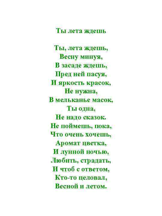 Ты лета ждешь Ты, лета ждешь, Весну минуя, В засаде ждешь, Пред ней пасуя, И яркость красок, Не нужна, В мельканье масок, Ты одна, Не надо сказок. Не поймешь, пока, Что очень хочешь, Аромат цветка, И лунной ночью, Любить, страдать, И чтоб с ответом, Кто-то целовал, Весной и летом.