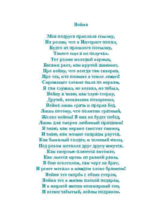 Война Моя подруга прислала ссылку, На ролик, что в Интернет попал, Будто из прошлого посылку, Такого еще я не получал. Тот ролик мелодий верных, Басами рвет, как крутой динамит, Про войну, что всегда так скверна, Про тех, кто поныне в земле лежит! Скрежещет словно пила по нервам, Я сам служил, не воевал, не забыл, Войну я знаю, как злую стерву, Друзей, воевавших похоронил, Война лишь грязь и прорва бед, Лишь потому, что политик грязный, Желал войны! В них не будет побед, Лишь для смерти любимый праздник! Я знаю, как нервно свистит свинец, И знаю, как мощно снаряды рвутся, Как бывалый солдат, и зеленый юнец, Под ревом металла другу жмутся. Как смертью плюется автомат, Как льется кровь из рваной раны, В бою оголтелом, сам черт не брат, И ревет металл в каждом слове бранном! Война это скорбь с обеих сторон, Война это в жизни плохой подарок, И в мирной жизни кошмарный сон, И всеми забытый, войны подранок.