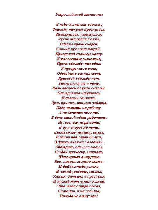 Утро любимой женщины В небе солнышко взошло, Значит, ты уже проснулась, Потянулась, улыбнулась, Лучик тянется в окно, Одеяло прочь скорей, Солнца луч меня погрей, Приласкай сияньем кожу, Удовольствие умножив, Прочь одежду, ты одна, У прозрачного окна, Одевайся в солнца свет, Красивей одежды нет. Так легко душе и телу, Коль оделась в лучик смелый, Настроения набралась, И делами занялась. День пришел, пришли заботы, Надо топать на работу, А не хочется чего-то, В день такой идти работать. Ну, все, пора идти, В душ скорее по пути, Взять белье, помаду, тушь, В ванну под горячий душ, А затем включи холодный, Оботрись, оденься модно, Создай прическу, макияж, Ювелирный антураж, Все, готова, можно ехать, И дай бог тебе успеха, И людей увидеть, милых, Умных, светлых и красивых. И пускай тот лучик солнца, Что тебя с утра обнял, Силы дал, и на сегодня, Никуда не отпускал!