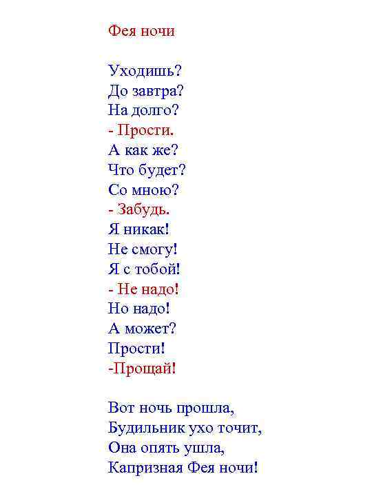 Фея ночи Уходишь? До завтра? На долго? - Прости. А как же? Что будет? Со мною? - Забудь. Я никак! Не смогу! Я с тобой! - Не надо! Но надо! А может? Прости! -Прощай! Вот ночь прошла, Будильник ухо точит, Она опять ушла, Капризная Фея ночи!