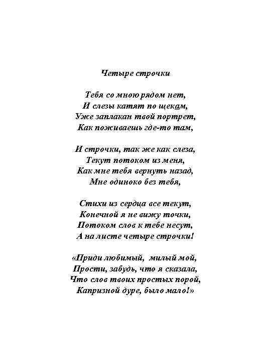 Четыре строчки Тебя со мною рядом нет, И слезы катят по щекам, Уже заплакан твой портрет, Как поживаешь где-то там, И строчки, так же как слеза, Текут потоком из меня, Как мне тебя вернуть назад, Мне одиноко без тебя, Стихи из сердца все текут, Конечной я не вижу точки, Потоком слов к тебе несут, А на листе четыре строчки! «Приди любимый, милый мой, Прости, забудь, что я сказала, Что слов твоих простых порой, Капризной дуре, было мало!»