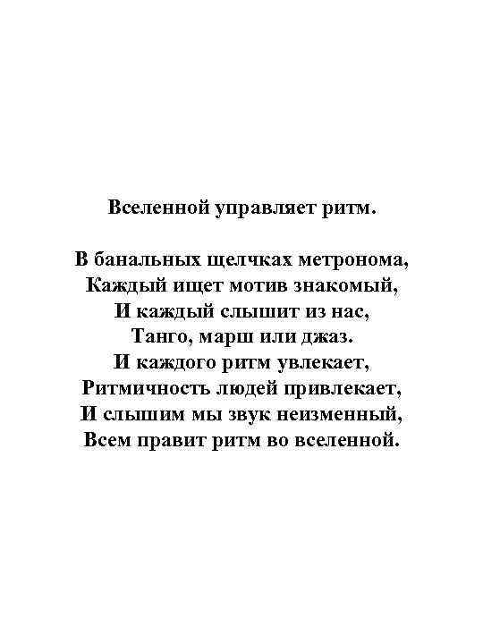 Вселенной управляет ритм. В банальных щелчках метронома, Каждый ищет мотив знакомый, И каждый слышит из нас, Танго, марш или джаз. И каждого ритм увлекает, Ритмичность людей привлекает, И слышим мы звук неизменный, Всем правит ритм во вселенной.