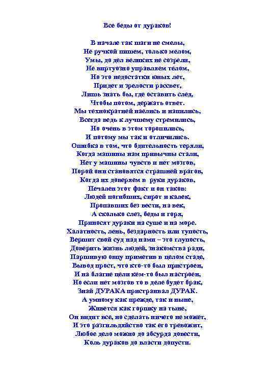 Все беды от дураков! В начале так шаги не смелы, Не ручкой пишем, только мелом, Умы, до дел великих не созрели, Не виртуозно управляем телом, Но это недостатки юных лет, Придет и зрелости рассвет, Лишь знать бы, где оставить след, Чтобы потом, держать ответ. Мы технократией наелись и напились, Всегда ведь к лучшему стремились, Но очень в этом торопились, И потому мы так и отличились. Ошибка в том, что бдительность теряли, Когда машины нам привычны стали, Нет у машины чувств и нет мозгов, Порой они становятся страшней врагов, Когда их доверяем в руки дураков, Печален этот факт и он таков: Людей погибших, сирот и калек, калек Пропавших без вести, на век, А сколько слез, беды и горя, Приносят дураки на суше и на море. Халатность, лень, бездарность или тупость, Вершит свой суд нами – это глупость, Доверить жизнь людей, знакомства ради, Паршивую овцу приметив в целом стаде, Вывод прост, что кто-то был пристроен, И на благие цели кем-то был настроен, Но если нет мозгов то в деле будет брак, Знай ДУРАКА пристраивал ДУРАК. А умному как прежде, так и ныне, Живется как горшку на тыне, Он видит все, но сделать ничего не может, И это разгильдяйство так его тревожит, Любое дело можно до абсурда довести, Коль дураков до власти допусти.