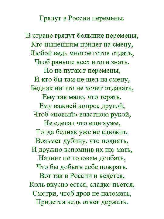 Грядут в России перемены. В стране грядут большие перемены, Кто нынешним придет на смену, Любой ведь многое готов отдать, Чтоб раньше всех итоги знать. Но не пугают перемены, И кто бы там не шел на смену, Бедняк ни что не хочет отдавать, Ему так мало, что терять. Ему важней вопрос другой, Чтоб «новый» властною рукой, Не сделал что еще хуже, Тогда бедняк уже не сдюжит. Возьмет дубину, что поднять, И дружно вспомнив их ню мать, Начнет по головам долбать, Что бы добыть себе пожрать. Вот так в России и ведется, Коль вкусно естся, сладко пьется, Смотри, чтоб дров не наломать, Придется ведь ответ держать.