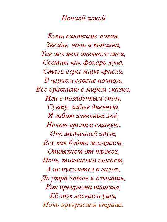 Ночной покой Есть синонимы покоя, Звезды, ночь и тишина, Так же нет дневного зноя, Светит как фонарь луна, Стали серы мира краски, В черном саване ночном, Все сравнимо с миром сказки, Или с позабытым сном, Суету, забыв дневную, И забот извечных ход, Ночью время я смакую, Оно медленней идет, Все как будто замирает, Отдыхает от тревог, Ночь, тихонечко шагает, А не пускается в галоп, До утра готов я слушать, Как прекрасна тишина, Её звук ласкает уши, Ночь прекрасная страна.