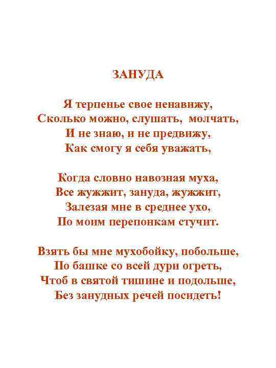 ЗАНУДА Я терпенье свое ненавижу, Сколько можно, слушать, молчать, И не знаю, и не предвижу, Как смогу я себя уважать, Когда словно навозная муха, Все жужжит, зануда, жужжит, Залезая мне в среднее ухо, По моим перепонкам стучит. Взять бы мне мухобойку, побольше, По башке со всей дури огреть, Чтоб в святой тишине и подольше, Без занудных речей посидеть!