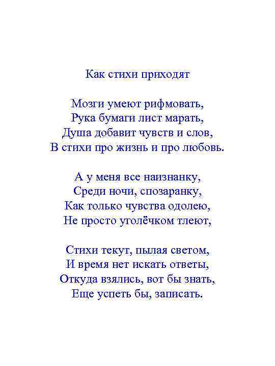 Как стихи приходят Мозги умеют рифмовать, Рука бумаги лист марать, Душа добавит чувств и слов, В стихи про жизнь и про любовь. А у меня все наизнанку, Среди ночи, спозаранку, Как только чувства одолею, Не просто уголёчком тлеют, Стихи текут, пылая светом, И время нет искать ответы, Откуда взялись, вот бы знать, Еще успеть бы, записать.