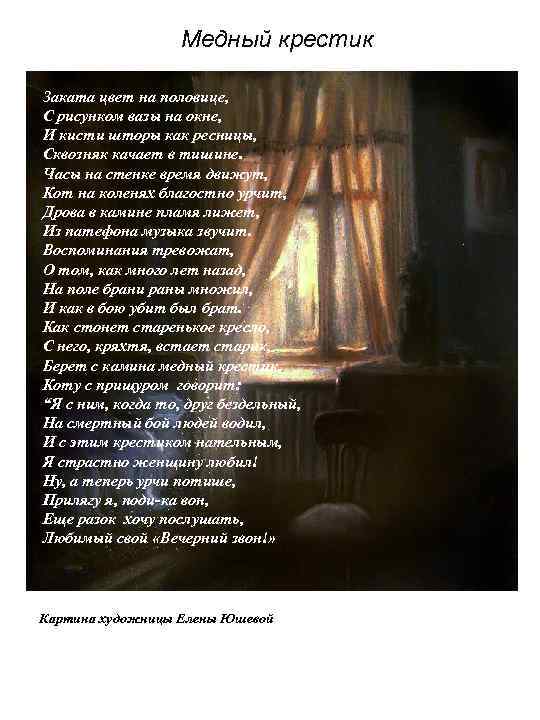 Медный крестик Заката цвет на половице, С рисунком вазы на окне, И кисти шторы как ресницы, Сквозняк качает в тишине. Часы на стенке время движут, Кот на коленях благостно урчит, Дрова в камине пламя лижет, Из патефона музыка звучит. Воспоминания тревожат, О том, как много лет назад, На поле брани раны множил, И как в бою убит был брат. Как стонет старенькое кресло, С него, кряхтя, встает старик, Берет с камина медный крестик, Коту с прищуром говорит: “Я с ним, когда то, друг бездельный, На смертный бой людей водил, И с этим крестиком нательным, Я страстно женщину любил! Ну, а теперь урчи потише, Прилягу я, поди-ка вон, Еще разок хочу послушать, Любимый свой «Вечерний звон!» Картина художницы Елены Юшевой