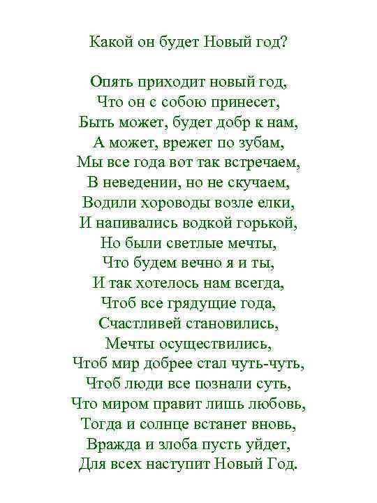 Какой он будет Новый год? Опять приходит новый год, Что он с собою принесет, Быть может, будет добр к нам, А может, врежет по зубам, Мы все года вот так встречаем, В неведении, но не скучаем, Водили хороводы возле елки, И напивались водкой горькой, Но были светлые мечты, Что будем вечно я и ты, И так хотелось нам всегда, Чтоб все грядущие года, Счастливей становились, Мечты осуществились, Чтоб мир добрее стал чуть-чуть, Чтоб люди все познали суть, Что миром правит лишь любовь, Тогда и солнце встанет вновь, Вражда и злоба пусть уйдет, Для всех наступит Новый Год.