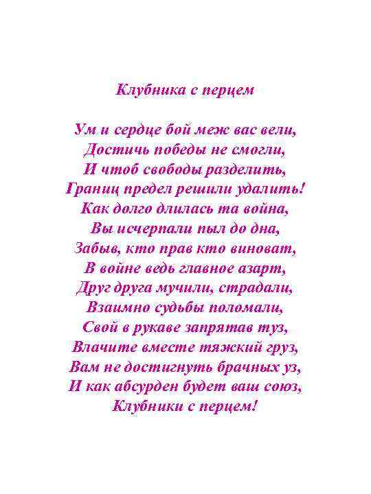 Клубника с перцем Ум и сердце бой меж вас вели, Достичь победы не смогли, И чтоб свободы разделить, Границ предел решили удалить! Как долго длилась та война, Вы исчерпали пыл до дна, Забыв, кто прав кто виноват, В войне ведь главное азарт, Друг друга мучили, страдали, Взаимно судьбы поломали, Свой в рукаве запрятав туз, Влачите вместе тяжкий груз, Вам не достигнуть брачных уз, И как абсурден будет ваш союз, Клубники с перцем!