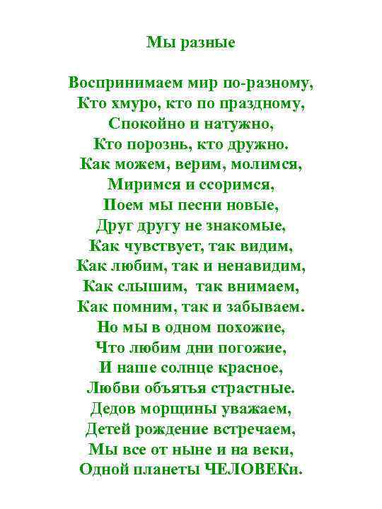 Мы разные Воспринимаем мир по-разному, Кто хмуро, кто по праздному, Спокойно и натужно, Кто порознь, кто дружно. Как можем, верим, молимся, Миримся и ссоримся, Поем мы песни новые, Друг другу не знакомые, Как чувствует, так видим, Как любим, так и ненавидим, Как слышим, так внимаем, Как помним, так и забываем. Но мы в одном похожие, Что любим дни погожие, И наше солнце красное, Любви объятья страстные. Дедов морщины уважаем, Детей рождение встречаем, Мы все от ныне и на веки, Одной планеты ЧЕЛОВЕКи.