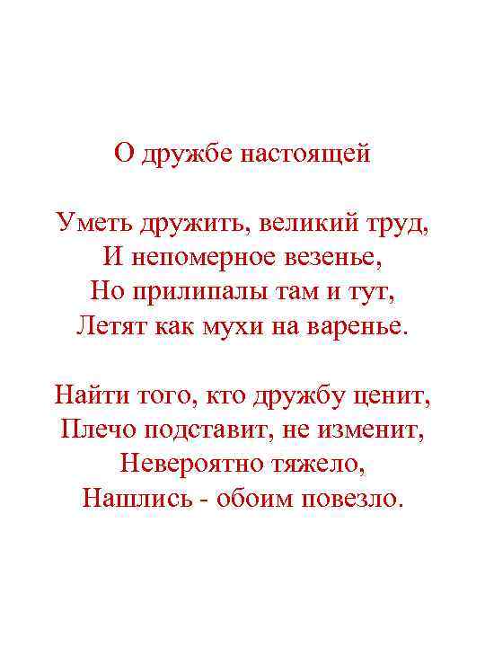 О дружбе настоящей Уметь дружить, великий труд, И непомерное везенье, Но прилипалы там и тут, Летят как мухи на варенье. Найти того, кто дружбу ценит, Плечо подставит, не изменит, Невероятно тяжело, Нашлись - обоим повезло.