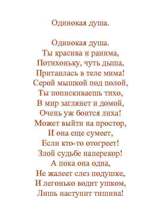 Одинокая душа. Ты красива и ранима, Потихоньку, чуть дыша, Притаилась в теле мима! Серой мышкой под полой, Ты попискиваешь тихо, В мир заглянет и домой, Очень уж боится лиха! Может выйти на простор, И она еще сумеет, Если кто-то отогреет! Злой судьбе наперекор! А пока она одна, Не жалеет слез подушке, И легонько водит ушком, Лишь наступит тишина!