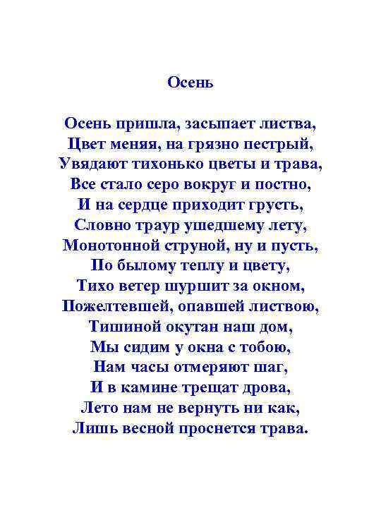Осень пришла, засыпает листва, Цвет меняя, на грязно пестрый, Увядают тихонько цветы и трава, Все стало серо вокруг и постно, И на сердце приходит грусть, Словно траур ушедшему лету, Монотонной струной, ну и пусть, По былому теплу и цвету, Тихо ветер шуршит за окном, Пожелтевшей, опавшей листвою, Тишиной окутан наш дом, Мы сидим у окна с тобою, Нам часы отмеряют шаг, И в камине трещат дрова, Лето нам не вернуть ни как, Лишь весной проснется трава.