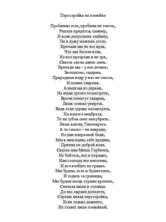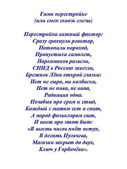 Гимн перестройке (или смех сквозь слезы) Перестройка важный фактор: Сразу грохнули реактор, Потопили пароход, Пропустили самолет, Наркоманов развели, СПИД в Россию завезли, Брежнев Лёня открой глазки: Нет не сыра, ни колбаски, Нет не пива, не вина, Радиация одна. Позабыв про срам и стыд, Каждый с матом ест и спит, А народ фольклором сыт, И поет про этот быт: «В шесть часов поёт петух, В десять Пугачева, Магазин закрыт до двух, Ключ у Горбачёва» .