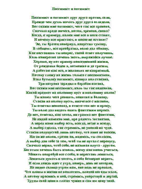 Пессимист и оптимист друга против, сели, Прежде чем дуэль начать друга оглядели, Вот скажи мне оптимист, чего так все хреново, Сначала вроде ничего, потом, хреново, снова? Когда, к примеру, палки мне все в ноги ставят, И почему все пристают, в покое не оставят? Эк, ты братец повернул, напустил туману, В «общем» , все преобразил, волю дал обману, Как поставишь ты вопрос, такой ответ получишь, Коль конкретно хочешь знать, выражайся лучше. Хорошо, ну вот пример повседневной жизни, От рожденья беден я, возможно и до тризны, А работаю как все, в желаньях не капризный, Потому гляжу на жизнь только с пессимизмом, Взял бутылку оптимист, капнул пол стакана, Три патрона зарядил в барабан нагана, Вот скажи мне пессимист, коль ты так подкован, Какой предмет на половину пуст и вполовину полон? Ты нашел чего ровнять, понятно и болвану, Стакан на полову пусть, иначе все с наганом, Ты ответил невпопад, в ответе том нет и проку, Ты волю дал видать опять фантазиям порока. Да нет, ответил, как хотел, ни грамма нет фантазии, Не кидай намеков мне, про радость эвтаназии, А перед нами выбор есть, всегда, везде и всюду, А выбор сделал, так стремись, не уповай на чудо. Стакан полупустой лишь потому, что явно не опасен, Наган же полон, грозен он, надеюсь, ты согласен, А выбор дан тебе за тем, чтоб ты не путал с перепугу, Сначала верил, чтоб себе, не называя плута - другом. Богатым хочешь быть изволь, всему как вновь учиться, Менять попробуй все с себя, и перестань лениться, Лениться думать и хотеть, в себя безмерно верить, И если дождь идет с утра, поверь, день не потерян, Не видно солнца утром нам, оно ведь не пропало, Что планы в жизни не воплотить, плохой погоды мало, А потому проснись и пой, стремись, упорствуй и дерзай, Труды свой цени в глазах чужих и сам им цену знай.