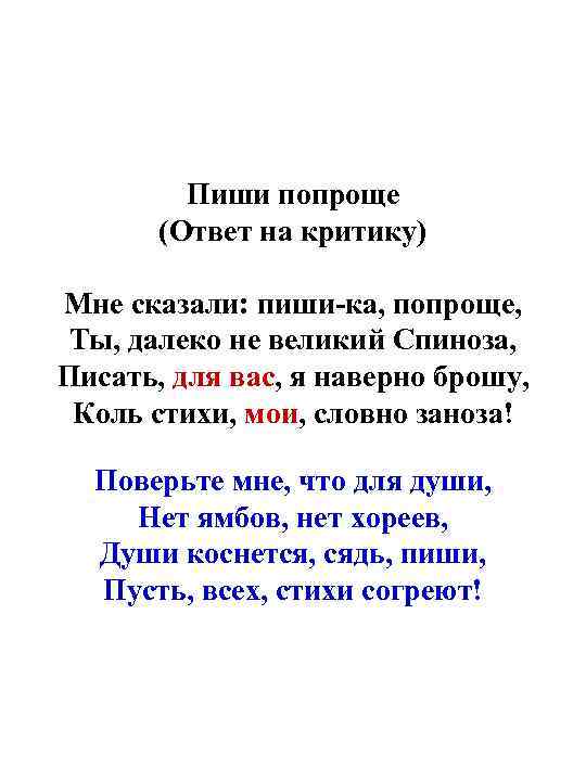 Пиши попроще (Ответ на критику) Мне сказали: пиши-ка, попроще, Ты, далеко не великий Спиноза, Писать, для вас, я наверно брошу, Коль стихи, мои, словно заноза! Поверьте мне, что для души, Нет ямбов, нет хореев, Души коснется, сядь, пиши, Пусть, всех, стихи согреют!